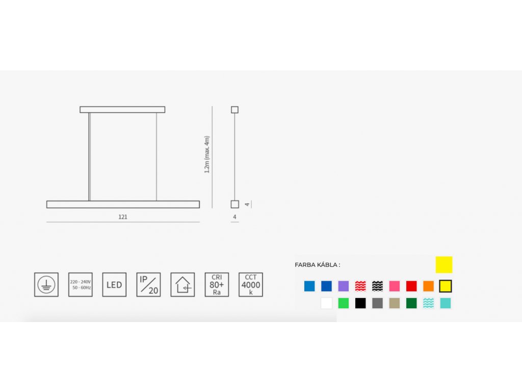 LED svietidlo Geminy je dodávané vo farbe svetla 3000K (neutrálna biela). Farebný kábel je žltý a bočná záslepka je medená.