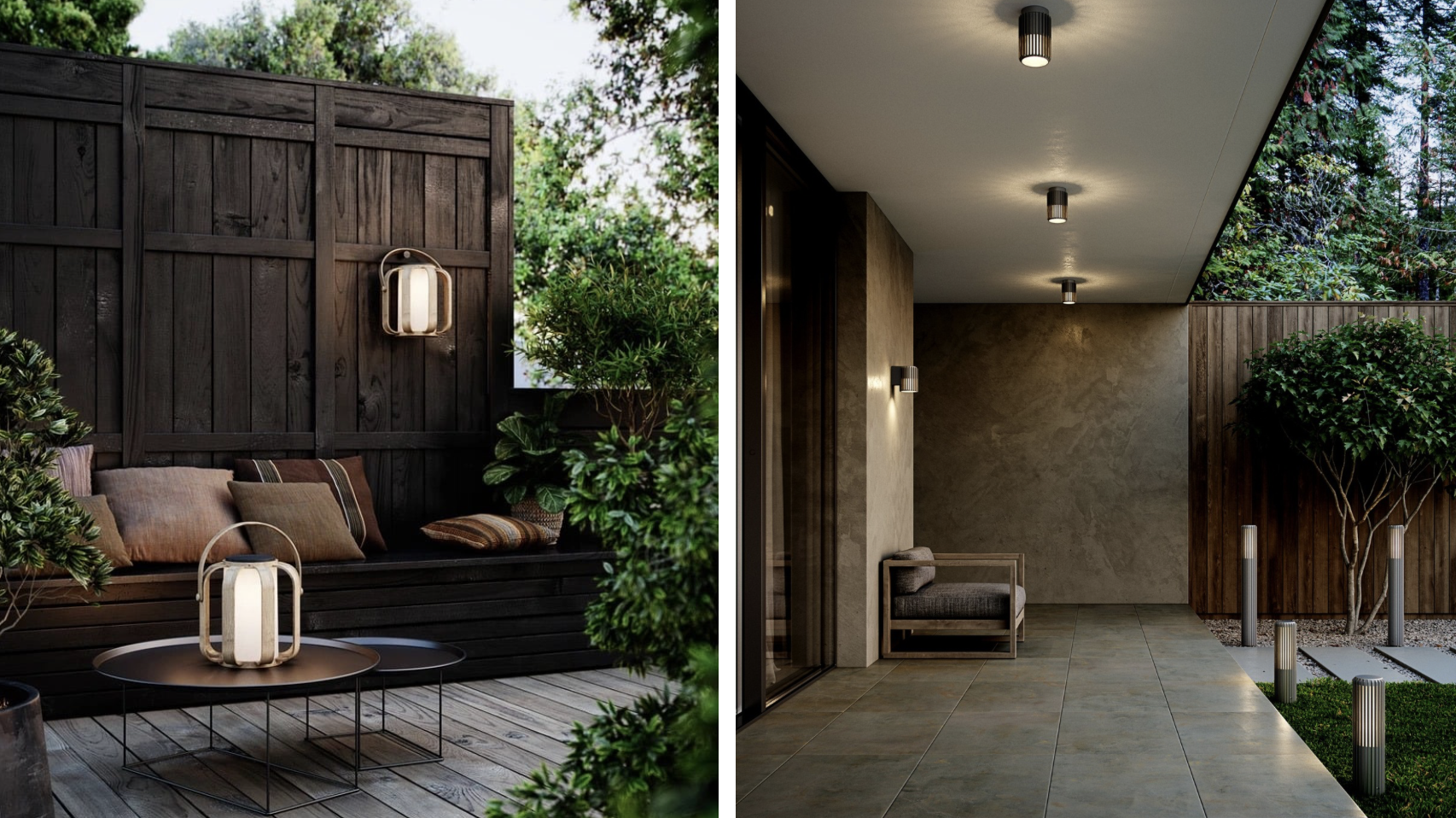 Na terasách a balkónoch sa uplatňujú najmä nástenné svietidlá, závesné svetlá a prenosné lampy s vyšším krytím. V záhradách a pri chodníkoch sú populárne zapustené svietidlá, stĺpikové osvetlenie a bodové svetlá na nasvietenie vegetácie alebo architektonických prvkov.